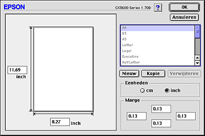 Als het juiste papierformaat niet voorkomt in de lijst Papierformaat van het dialoogvenster voor de pagina-instelling, ga dan als volgt te werk om zelf een nieuw papierformaat te definiëren.