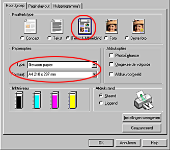 Klik op het tabblad Hoofdgroep en selecteer Gewoon papier en A4 bij Papieropties, en Tekst & Afbeelding bij Kwaliteitstype.