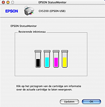 U kunt dit programma ook gebruiken om vóór het afdrukken het inktniveau te controleren. EPSON StatusMonitor toont hoeveel resterende inkt er nog is op het moment dat u het programma hebt geopend. Als u de informatie over de hoeveelheid resterende inkt wilt actualiseren, klikt u op de knop Updaten.