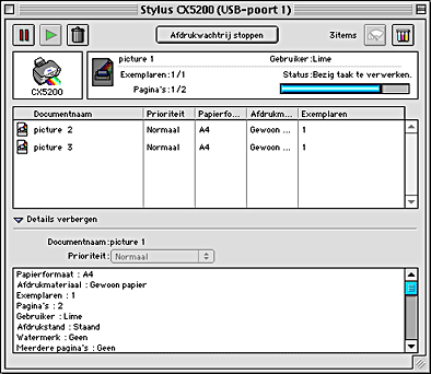 Nadat u een afdruktaak naar het apparaat hebt gestuurd, kunt u met behulp van het hulpprogramma EPSON Monitor IV afdruktaken die in de wachtrij staan, bekijken, annuleren of van volgorde wijzigen. Het hulpprogramma toont bovendien de status van de huidige afdruktaak.