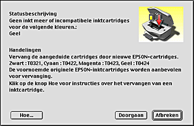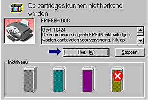 Als de inkt (bijna) op is, verschijnt onder het tekstvak een knop Hoe. Als u op Hoe klikt, wordt u door EPSON Status Monitor 3 stap-voor-stap begeleid bij de procedure voor het vervangen van de cartridge.