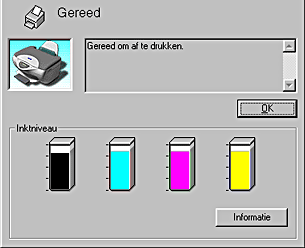 Dit venster geeft de voortgang van de huidige afdruktaak aan en bevat informatie over de status van het apparaat wanneer communicatie in twee richtingen tussen het apparaat en de computer tot stand is gebracht. In dit venster verschijnen bovendien foutberichten en nuttige tips voor het afdrukken. Raadpleeg het betreffende gedeelte hierna.