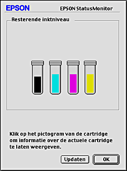 EPSON StatusMonitor toont hoeveel inkt er nog rest vanaf het moment dat u het programma hebt geopend. Als u de informatie over de hoeveelheid resterende inkt wilt actualiseren, klikt u op de knop Updaten.