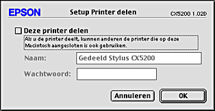 Schakel het selectievakje Deze printer delen (Share this Printer) in en typ vervolgens, indien nodig, de naam van de printer en een wachtwoord.