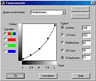 Met de functie Tooncorrectie beschikt u over voorgedefinieerde tooncorrectiekrommen waarmee u het contrast van een afbeelding kunt aanpassen. Wanneer u deze functie gebruikt in combinatie met de instellingen in het dialoogvenster Beeldbewerking, krijgt u meer controle over de afbeelding.