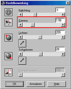 Verplaats de schuifbalk Gamma naar links of rechts, of typ een waarde tussen 0,5 en 5,0 in het tekstvak.