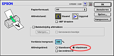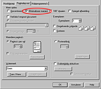 Als u het afdrukgebied vergroot door Minimaliseer marges te selecteren bij Meer opties (Windows) of Maximum bij Afdrukgebied (Macintosh), kan het afgesneden hoekje problemen veroorzaken bij het afdrukken.