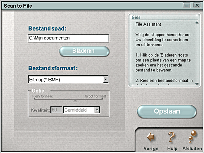 Met deze toepassing kunt u afbeeldingen scannen, omzetten en vervolgens opslaan in een specifieke map. Wanneer u deze toepassing start, wordt een afbeelding gescand met behulp van EPSON TWAIN en weergegeven in het dialoogvenster Verify Assistant. Als u op Opslaan klikt, verschijnt het volgende dialoogvenster. Raadpleeg de documentatie bij EPSON Smart Panel voor meer informatie.