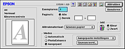 Met de opties voor Modus in het afdrukvenster hebt u de beschikking over drie besturingsniveaus voor de printersoftware. Dit wordt hierna uitgelegd.