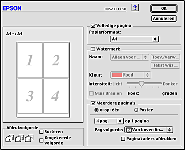 Hiermee worden twee of vier pagina's van uw document afgedrukt op één vel papier. |