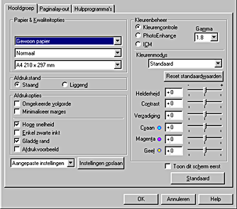 Voor gebruik met de methoden voor kleuraanpassing en beeldverbetering die door de printerdriver worden geboden. Wanneer u dit keuzerondje inschakelt, worden extra instellingen weergegeven onder de opties voor Kleurenbeheer. U kunt dan een kleurenmodus selecteren en de kleuren aanpassen met behulp van de schuifbalken.