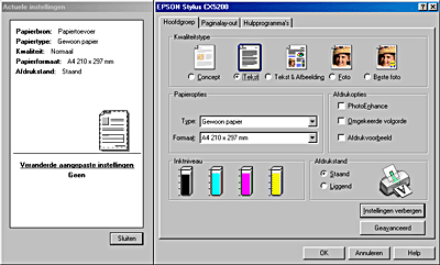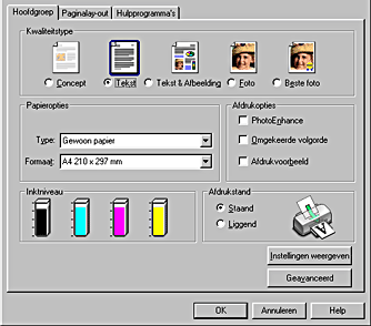 Via het tabblad Hoofdgroep kunt u de instellingen vastleggen voor Kwaliteitstype, Papieropties, Afdrukopties, Afdrukstand en Geavanceerde instellingen. Ook kunt u hier de inktniveaus controleren. Raadpleeg het betreffende gedeelte hierna.