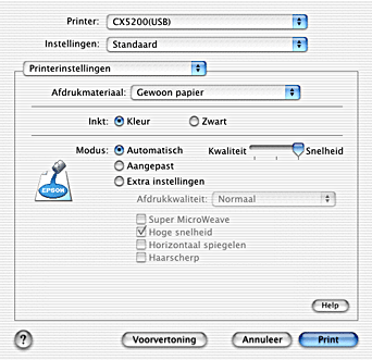 De instellingen bij Modus in het afdrukvenster (wanneer de optie Printerinstellingen is geselecteerd) ondersteunen diverse opties. Het afdrukvenster met de optie Printerinstellingen geselecteerd ziet u hier: