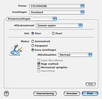 Deze modus maakt het mogelijk om gedetailleerdere instellingen te kiezen voor het afdrukken. Zie De modus Extra instellingen gebruiken voor meer informatie hierover. |