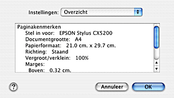 Door in het dialoogvenster voor de pagina-instellingen de optie Overzicht te selecteren bij Instellingen kunt u de instellingen van het dialoogvenster voor de pagina-instellingen nog eens nakijken.