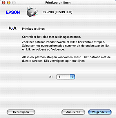 Zoek een patroon zonder zwarte of witte strepen. Zoek vervolgens het bijbehorende patroonnummer in de keuzelijst in het dialoogvenster Printkop uitlijnen. Klik op Volgende. De nieuwe instelling wordt doorgevoerd.