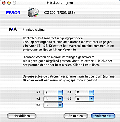 Kies van elk patroon op het afgedrukte testblad de verticale lijn die het beste is uitgelijnd. Selecteer in het dialoogvenster Printkop uitlijnen het betreffende lijnnummer in de keuzelijst en klik vervolgens op Volgende. De nieuwe instelling wordt doorgevoerd.