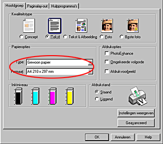 ![]() | Voor Windows: selecteer het gewenste Formaat en Type bij Papieropties op het tabblad Hoofdgroep. Selecteer vervolgens Staand (verticaal) of Liggend (horizontaal) om de afdrukstand van het document op het papier op te geven. |