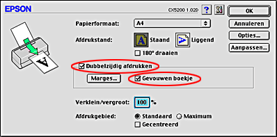 Voor Macintosh: schakel in het dialoogvenster voor de lay-out het selectievakje Dubbelzijdig afdrukken en het selectievakje Gevouwen boekje in.