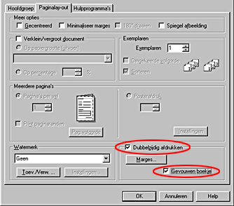 Voor Windows: schakel op het tabblad Paginalay-out het selectievakje Dubbelzijdig afdrukken en het selectievakje Gevouwen boekje in.