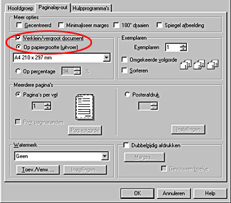 Voor Windows: selecteer het papierformaat dat u in het apparaat hebt geladen bij Op papiergrootte (uitvoer) op het tabblad Paginalay-out.