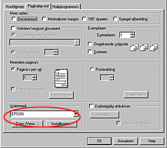 Voor Macintosh: schakel in het dialoogvenster voor de lay-out het selectievakje Watermerk in en selecteer vervolgens het gewenste watermerk in de lijst Naam.