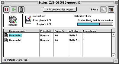 EPSON Spool Manager is vergelijkbaar met Afdrukbeheer onder Windows. Als twee of meer afdruktaken tegelijk worden ontvangen, worden deze vastgehouden in de volgorde waarin ze zijn ontvangen. (Bij printers in een netwerk wordt dit een afdrukwachtrij genoemd.) Als een afdruktaak bovenaan komt te staan, wordt deze door EPSON Spool Manager naar de printer gestuurd. Via de Spool Manager kunt u afdruktaken annuleren. Van de afdruktaken die naar het apparaat zijn gestuurd kunt u de status weergeven en u hebt de mogelijkheid om afdruktaken te onderbreken en te hervatten.