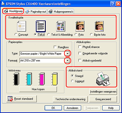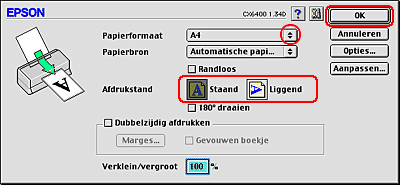Selecteer Staand (verticaal) of Liggend (horizontaal) om de afdrukrichting te wijzigen
