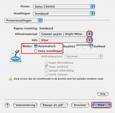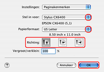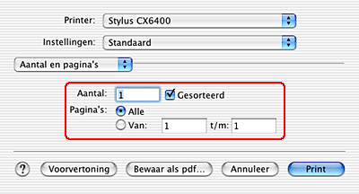 De instellingen voor Aantal en pagina's zijn de standaardinstellingen van Mac OS X. Raadpleeg de documentatie bij uw besturingssysteem voor meer informatie.