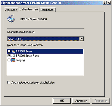 Onder Windows kunt u behalve EPSON Smart Panel elke gewenste toepassing die scannergebeurtenissen ondersteunt (zoals Imaging voor Windows, als dit tenminste is geïnstalleerd) aan de koppen van het bedieningspaneel toewijzen. Wanneer u op de knoppen op het bedieningspaneel drukt, wordt het dialoogvenster van EPSON Scan geopend of wordt het scannen gestart en wordt de gescande afbeelding automatisch verzonden naar de toepassing (die u niet zelf hoeft te openen).