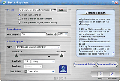 Met deze toepassing kunt u afbeeldingen scannen, omzetten en vervolgens opslaan in een specifieke map. U kunt afbeeldingen ook omzetten met PRINT Image Matching en verschillende kleureffecten toepassen op de gescande afbeelding. Als u op het pictogram Scannen op opslaan klikt, verschijnt het volgende dialoogvenster. Klik op Scannen en opslaan om het scannen te starten of Scannen met opties om de scaninstellingen te wijzigen.