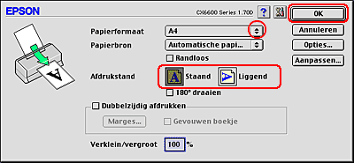 Selecteer Staand (verticaal) of Liggend (horizontaal) om de afdrukrichting te wijzigen