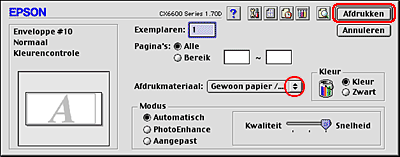 Selecteer Stylus CX6600 bij Printer en geef de gewenste instellingen op bij Aantal en pagina's.