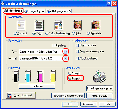 Selecteer Liggend (horizontaal) als Afdrukstand.