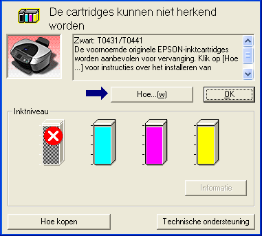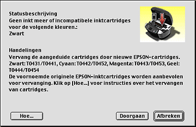 Als de inkt (bijna) op is, verschijnt onder het tekstvak een knop Hoe. Als u op Hoe klikt, wordt u door EPSON Status Monitor 3 stap-voor-stap begeleid bij de procedure voor het vervangen van de cartridge.