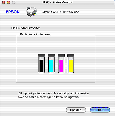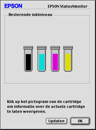 U kunt dit programma ook gebruiken om vóór het afdrukken het inktniveau te controleren. EPSON StatusMonitor toont hoeveel resterende inkt er nog is op het moment dat u het programma hebt geopend. Als u de informatie over de hoeveelheid resterende inkt wilt actualiseren, klikt u op Updaten.