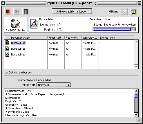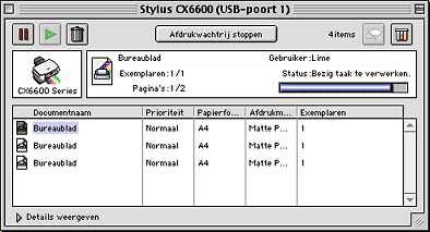 Nadat u een afdruktaak naar het apparaat hebt gestuurd, kunt u met behulp van het hulpprogramma EPSON MonitorIV afdruktaken die in de wachtrij staan, bekijken, annuleren of van volgorde wijzigen. Het hulpprogramma toont bovendien de status van de huidige afdruktaak.