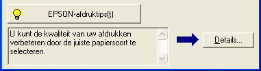 In het tekstvak onderaan het venster van de voortgangsbalk worden tips weergegeven voor een optimaal gebruik van uw Epson-printersoftware. Er verschijnt een nieuwe tip om de 30 seconden. Als u meer informatie wilt over een tip die wordt weergegeven, klikt u op de knop Details.