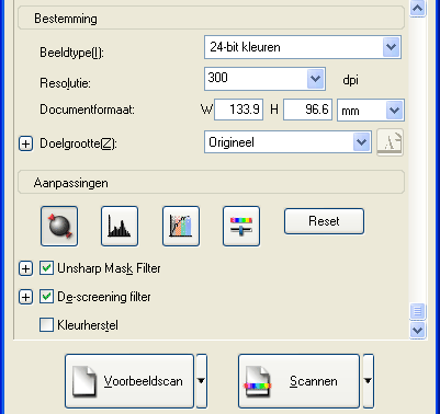Als al is bepaald welk formaat de gescande afbeelding moet krijgen, selecteert u de betreffende instelling in de lijst Doelgrootte. In het Voorbeeldscan-venster wordt een selectiekader weergegeven met de afmetingen van het opgegeven doelformaat. U kunt dit selectiekader verplaatsen naar het deel van de afbeelding dat u wilt scannen. Zie de online-Help voor meer informatie.