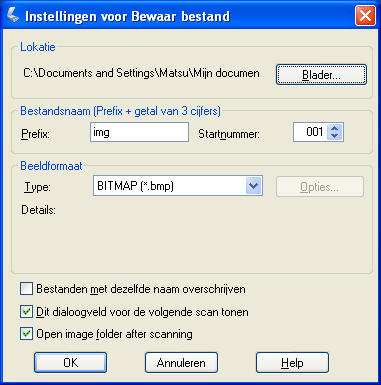 Als het selectievakje Afbeeldingsmap openen na het scannen in het dialoogvenster Instellingen voor Bewaar bestand is ingeschakeld, zal Windows Verkenner (Explorer, Windows) of Finder (Macintosh) zodra EPSON Scan klaar is met scannen, automatisch de map openen waarin de scan is opgeslagen.