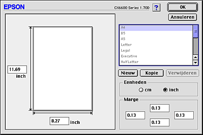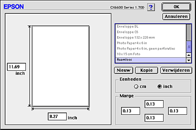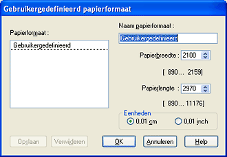 U kunt maximaal honderd papierformaten definiëren. De namen van de zelfgemaakte formaten worden weergegeven in de lijst Papierformaat.