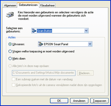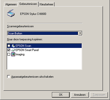Onder Windows kunt u behalve EPSON Smart Panel elke gewenste toepassing die scannergebeurtenissen ondersteunt (zoals Imaging voor Windows, als dit tenminste is geïnstalleerd) aan de koppen van het bedieningspaneel toewijzen. Wanneer u op de knoppen op het bedieningspaneel drukt, wordt het dialoogvenster van EPSON Scan geopend of wordt het scannen gestart en wordt de gescande afbeelding automatisch verzonden naar de toepassing (die u niet zelf hoeft te openen).