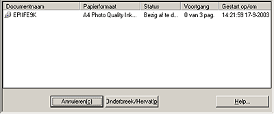 EPSON Spool Manager is vergelijkbaar met Afdrukbeheer onder Windows. Als twee of meer afdruktaken tegelijk worden ontvangen, worden deze vastgehouden in de volgorde waarin ze zijn ontvangen. (Bij printers in een netwerk wordt dit een afdrukwachtrij genoemd.) Als een afdruktaak bovenaan komt te staan, wordt deze door EPSON Spool Manager naar de printer gestuurd. Via de Spool Manager kunt u afdruktaken annuleren. Van de afdruktaken die naar het apparaat zijn gestuurd kunt u de status weergeven en u hebt de mogelijkheid om afdruktaken te onderbreken en te hervatten.