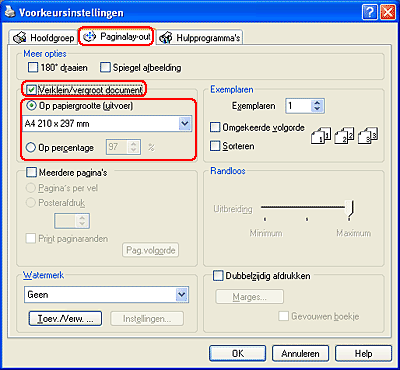 Klik op het tabblad Paginalay-out en schakel het selectievakje Verklein/vergroot document in. U kunt de grootte van uw document aanpassen met de volgende instellingen.