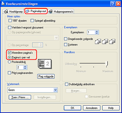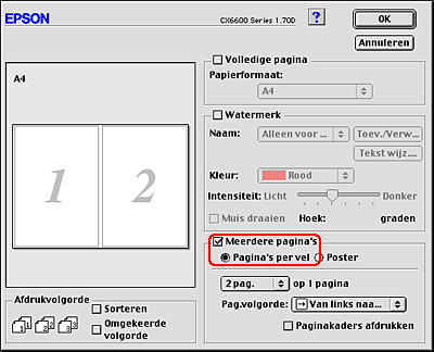 Hiermee worden twee of vier pagina's van uw document afgedrukt op één vel papier. |