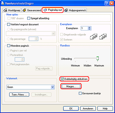 De werkelijke rugmarge kan afwijken van de opgegeven instellingen. Dit hangt af van de toepassing waarmee u werkt. Probeer daarom eerst een paar vellen uit om te zien wat het resultaat zal zijn, voordat u de volledige afdruktaak afdrukt.