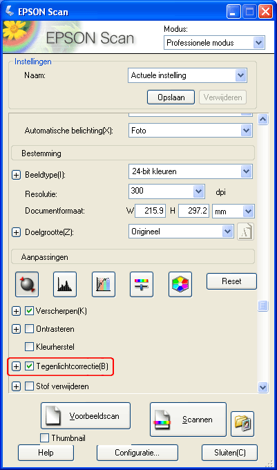 Ga als volgt te werk om foto's met tegenlicht te corrigeren met Epson Scan.