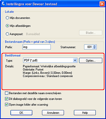 ![]() Selecteer de gewenste instellingen voor uw document en klik op OK. U keert terug naar het dialoogvenster Instellingen voor Bewaar bestand.