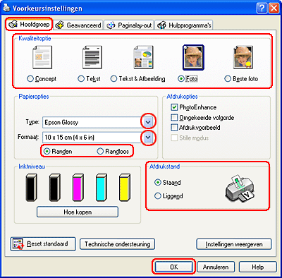 Klik op het tabblad Hoofdgroep en selecteer een van de volgende instellingen bij Kwaliteitoptie: