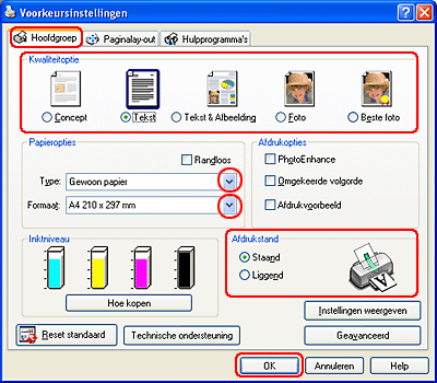 Geef de gewenste instellingen op bij Papierformaat en Richting. U kunt ook een aangepast papierformaat definiëren. Zie de online-Help voor meer informatie.